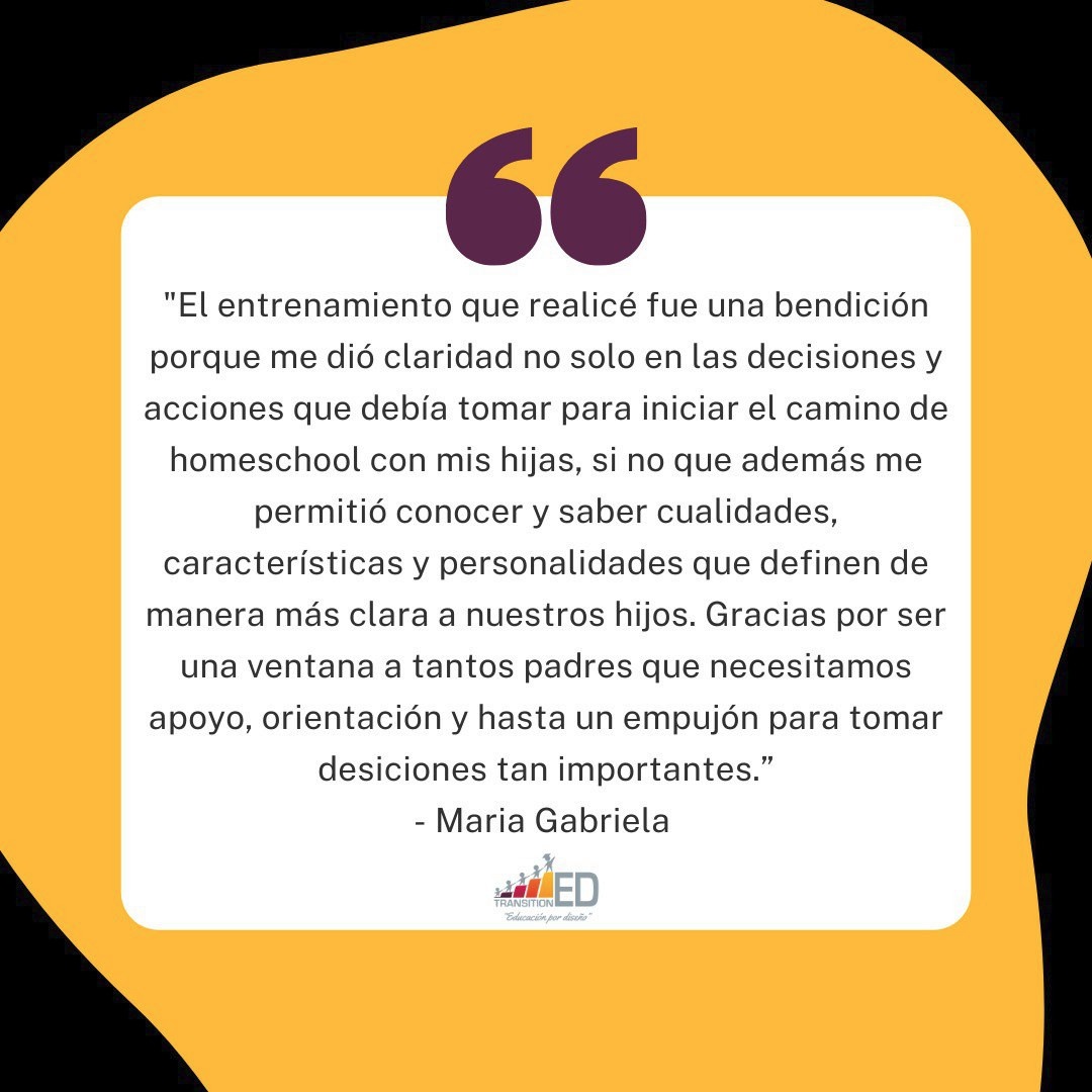 Esta academia de entrenamiento para padres nace en el 2017 al ver la necesidad en la comunidad hispanohablante de implementar un modelo educativo más flexible, personalizado y promotor de los talentos y las capacidades innatas de los estudiantes. Transitioned es una respuesta a la necesidad de la comunidad hispana donde puede encontrar herramientas, asesoría, capacitación y un equipo de apoyo para establecer un diseño educativo original en el hogar.